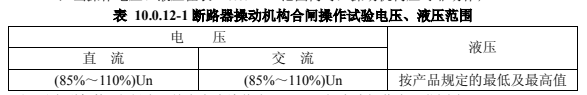 1)當操作電壓、液壓在表 10.0.12-1 范圍內時,操動機構應可靠動作;